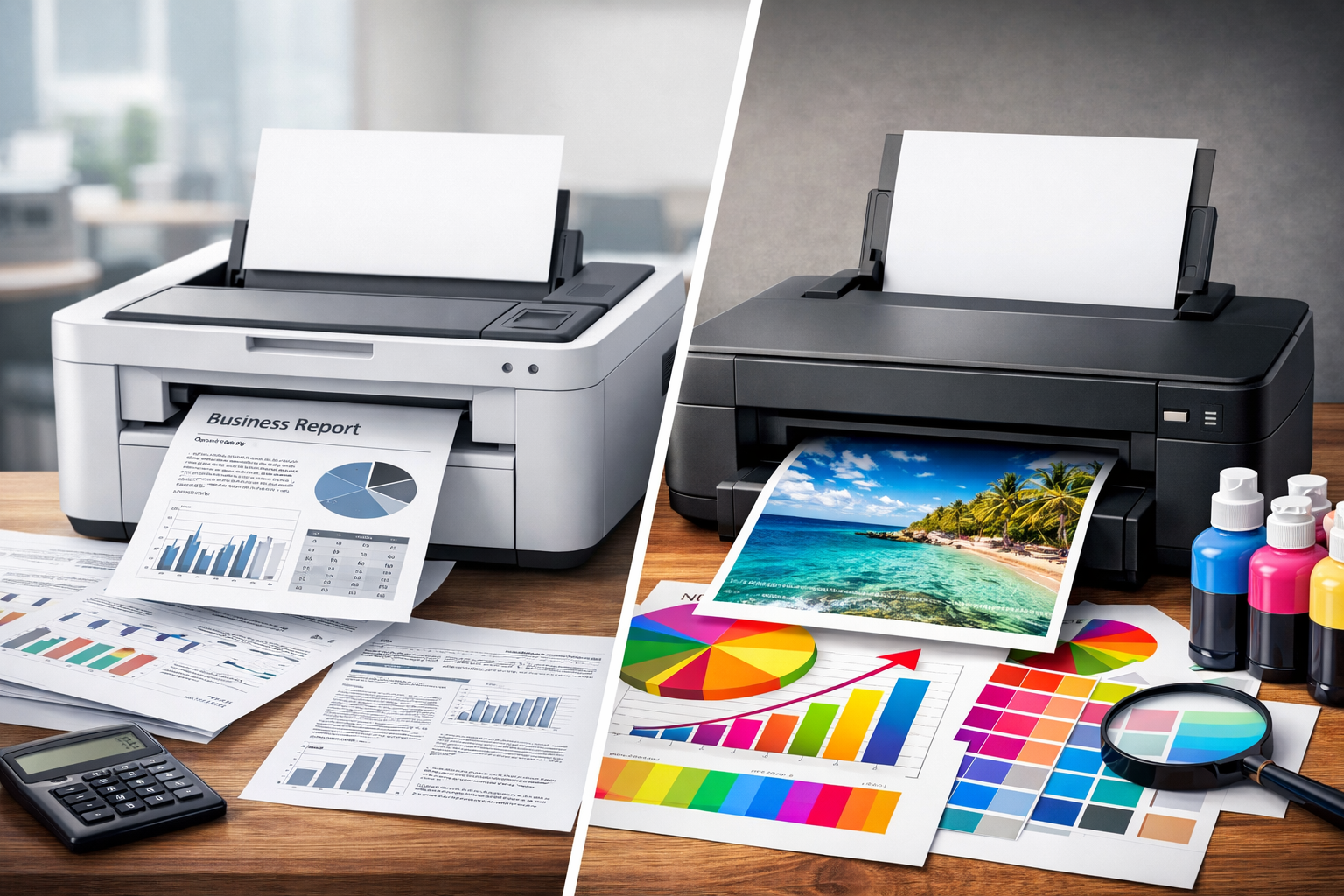 Струйные принтеры обычно стоят дешевле при покупке, но расходные материалы обходятся дороже при активной цветной печати. При этом они универсальны: на одном устройстве можно печатать текстовые документы, изображения и фотографии с хорошим качеством.